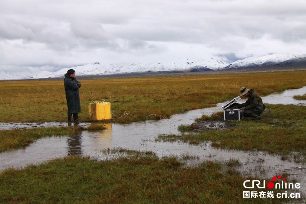 Ruogaier-Flower Lake Scientific Research Station: Researchers detects the discharge of methane gas. (CRI/Chen Jiadi)