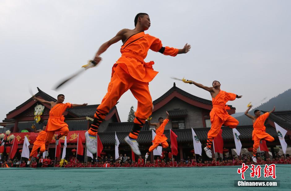 Competitors show kung fu during the 10th Intl' Shaolin Wushu Festival in Dengfeng, central China's Henan province, Oct. 20, 2014. Nearly 2000 kung fu masters from 63 countries participated in the festival. (CNS/Yang Zhenghua)