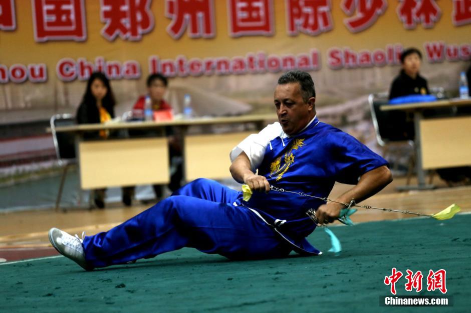 Competitor shows kung fu during the 10th Intl' Shaolin Wushu Festival in Dengfeng, central China's Henan province, Oct. 20, 2014. Nearly 2000 kung fu masters from 63 countries participated in the festival. (CNS/Yang Zhenghua)