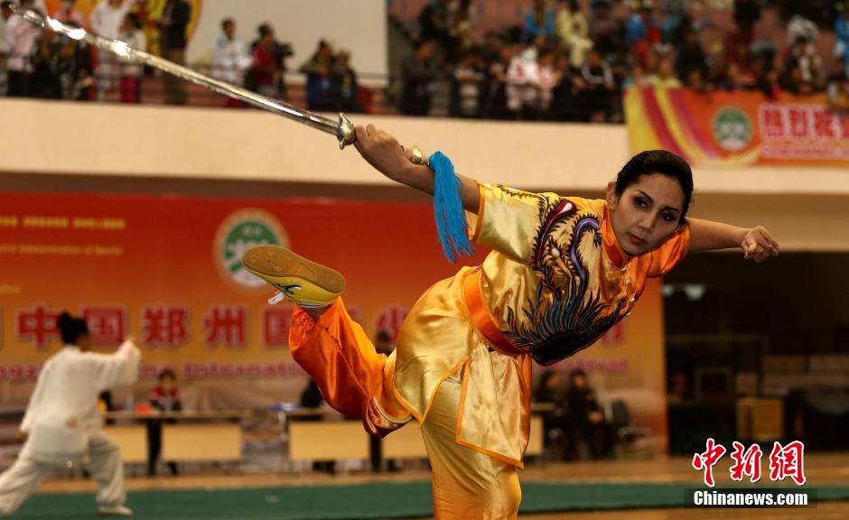 Competitor shows kung fu during the 10th Intl' Shaolin Wushu Festival in Dengfeng, central China's Henan province, Oct. 20, 2014. Nearly 2000 kung fu masters from 63 countries participated in the festival. (CNS/Yang Zhenghua)