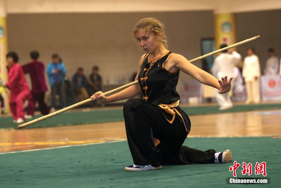 Competitor shows kung fu during the 10th Intl' Shaolin Wushu Festival in Dengfeng, central China's Henan province, Oct. 20, 2014. Nearly 2000 kung fu masters from 63 countries participated in the festival. (CNS/Yang Zhenghua)