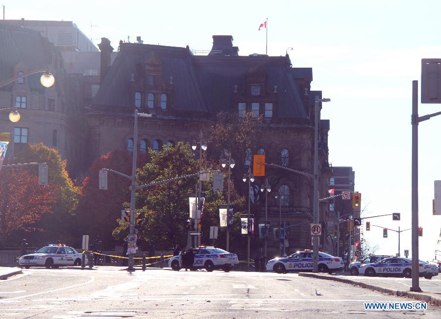 Policemen guard outside the Chancellery after a shoot case in Ottawa, Canada, on Oct. 22, 2014. A Canadian soldier standing guard at the National War Memorial in Ottawa was gunned down and a security guard in the nearby parliament buildings wounded on Wednesday in an attack that police believe involved more than one gunman. (Xinhua/Li Baodong)