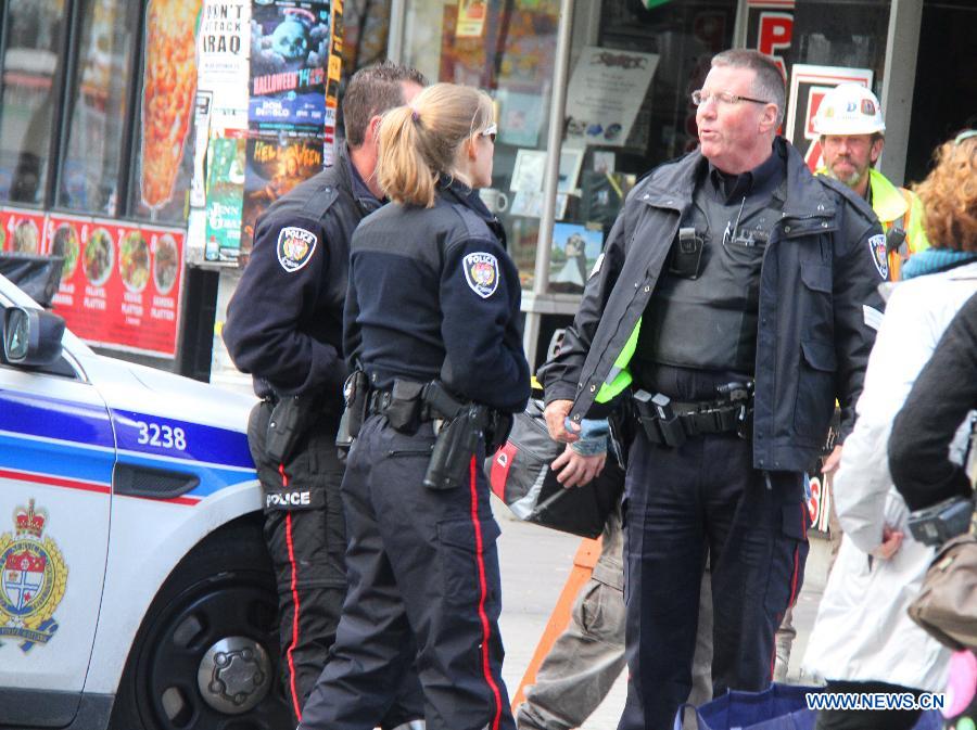 Policemen blank off the street near the Canadian parliament building in Ottawa, Canada, on Oct. 22, 2014. A Canadian soldier standing guard at the National War Memorial in Ottawa was gunned down and a security guard in the nearby parliament buildings wounded on Wednesday in an attack that police believe involved more than one gunman. (Xinhua/Li Baodong)