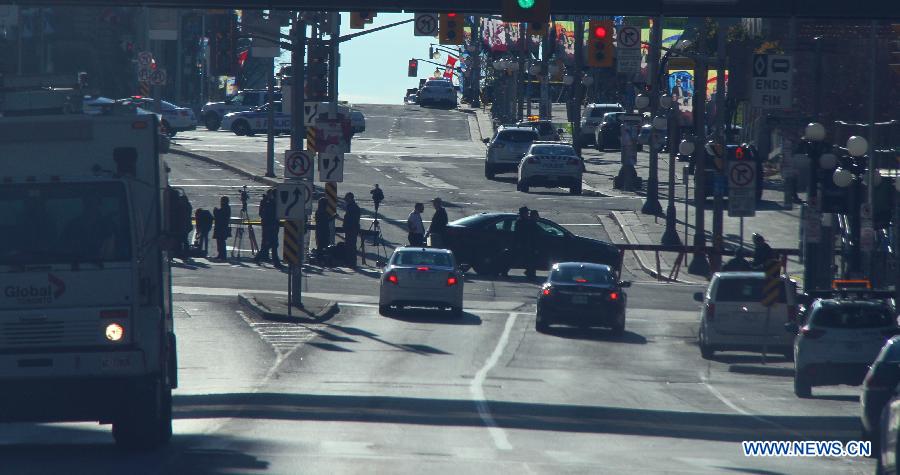 A street blanked off by policemen is seen near the Canadian parliament building in Ottawa, Canada, on Oct. 22, 2014. A Canadian soldier standing guard at the National War Memorial in Ottawa was gunned down and a security guard in the nearby parliament buildings wounded on Wednesday in an attack that police believe involved more than one gunman. (Xinhua/Li Baodong)