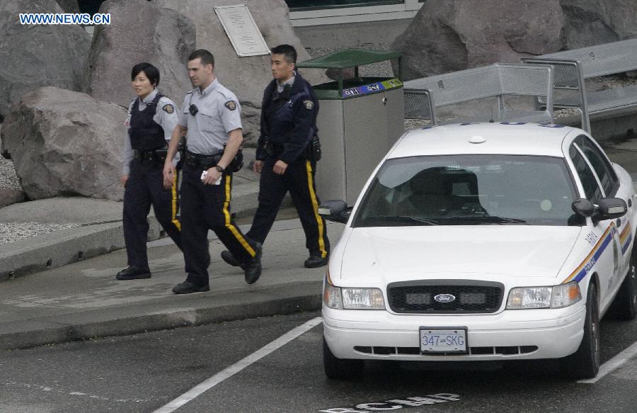 Policemen patrol around the building of the Vancouver International Airport in Vancouver, Canada, Oct. 22, 2014. After the shooting at the National War Memorial and Parliament Hill in Ottawa on Wednesday, Provinces across Canada stepped up the security measures including airports have been heightened their security levels in response to the terrorist attack.(Xinhua/Liang Sen)