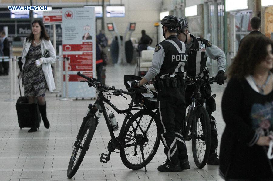 Two policemen patrol with bicycles at the Vancouver International Airport in Vancouver, Canada, Oct. 22, 2014. After the shooting at the National War Memorial and Parliament Hill in Ottawa on Wednesday, Provinces across Canada stepped up the security measures including airports have been heightened their security levels in response to the terrorist attack.(Xinhua/Liang Sen)
