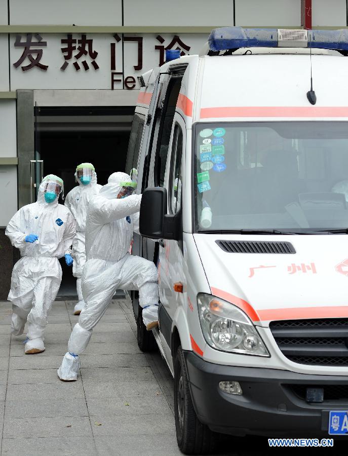 Medical workers take part in a drill to deal with Ebola cases at the Guangzhou Eighth People's Hospital in Guangzhou, capital of south China's Guangdong Province, Oct. 23, 2014. Guangdong has ruled out possible Ebola cases as 43 people suspected of infection tested negative for the deadly virus. A total of 8,672 people from Ebola-ridden areas entered the province since August 23, and so far, 5,437 people have been discharged from medical observation. (Xinhua/Liu Dawei)