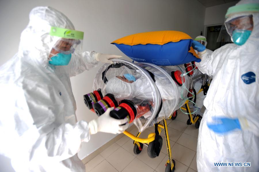 Medical workers take part in a drill to deal with Ebola cases at the Guangzhou Eighth People's Hospital in Guangzhou, capital of south China's Guangdong Province, Oct. 23, 2014. Guangdong has ruled out possible Ebola cases as 43 people suspected of infection tested negative for the deadly virus. A total of 8,672 people from Ebola-ridden areas entered the province since August 23, and so far, 5,437 people have been discharged from medical observation. (Xinhua/Liu Dawei)
