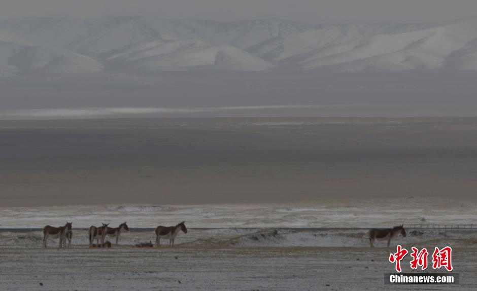 A flock of Tibetan antelopes seek food in the snow in Hoh Xil Region, northwest China's Qinghai Province, Sept. 26, 2014. (Chinanews.com/Liu Guanguan)
