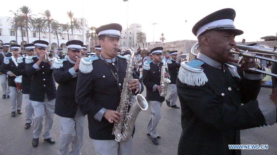 Libyans attend a ceremony to mark the third anniversary of the declaration of the liberation from former leader Gaddafi, at the Martyrs' Square in Tripoli, capital of Libya, on Oct. 23, 2014. (Xinhua/Hamza Turkia)