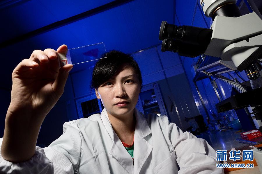 Chen Rong carefully examines a pathological section of animal organs in her lab - Sept.16, 2014. (Photo/Xinhua)