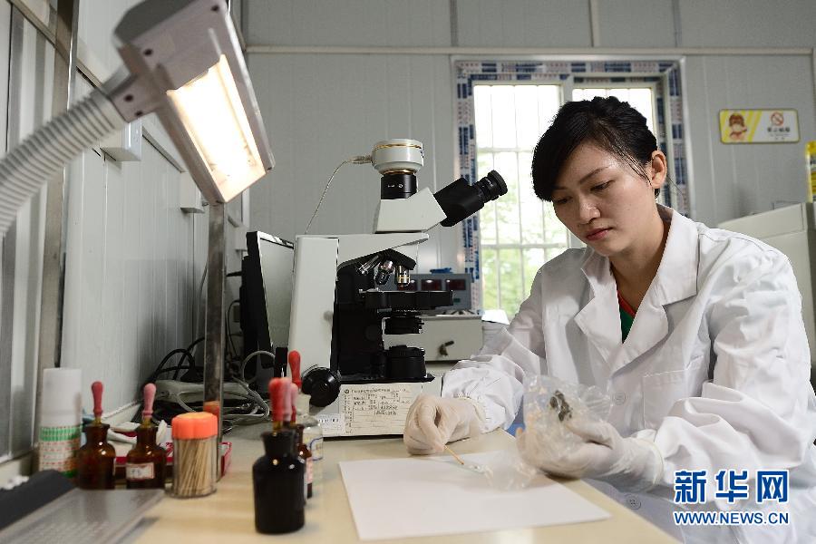 Chen Rong conducts parasite detection of animal waste in her lab - Sept.16, 2014. (Xinhua/Li Xiang)