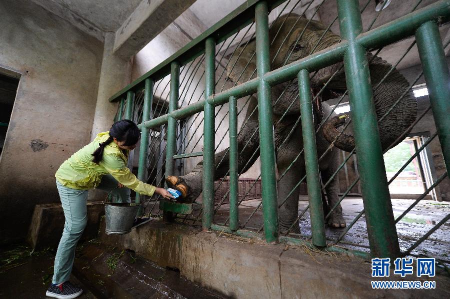 Chen Rong trims the nails of an adult elephant - Sept. 16, 2014. (Xinhua/Li Xiang)