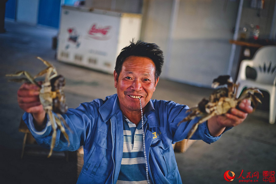 Photo shows the harvest of the hairy crabs in Yangcheng Lake in Jiangsu province. (People's Daily Online/Wang Chu)
