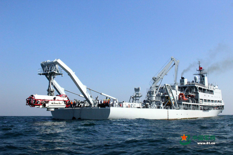 From October 21 to October 23, 2014, a rescue team of the North China Sea Fleet conducts a recue drill in bad weather conditions. A LR-7 type deep submergence rescue vessel successfully connected with a submarine 40 meters under the sea surface and transferred 8 submariners. (www. 81.cn/Wang Changxin and Meng Lingyu)