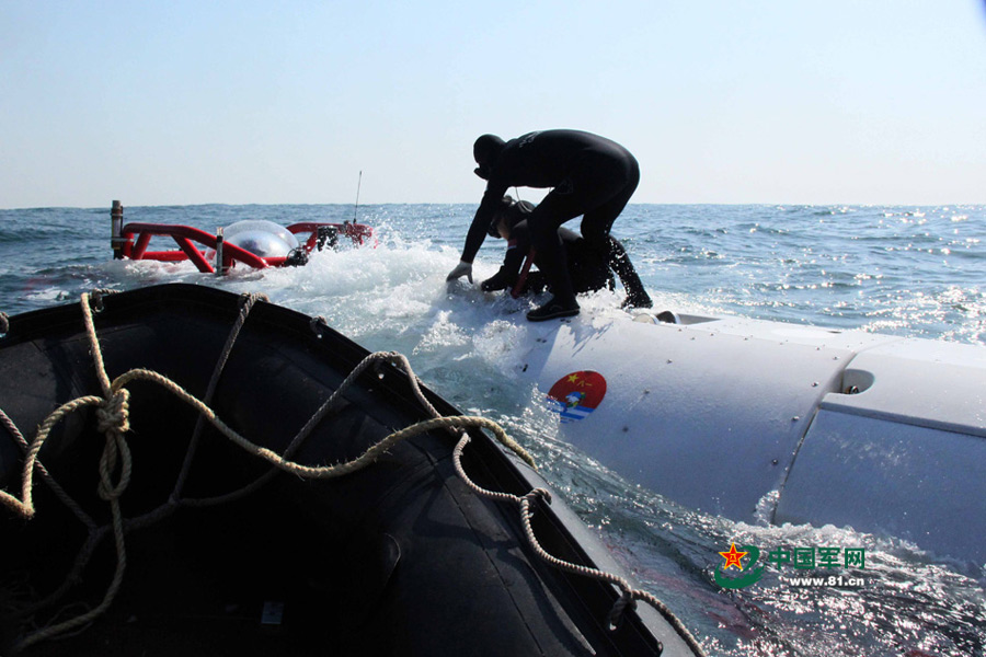 | From October 21 to October 23, 2014, a rescue team of the North China Sea Fleet conducts a recue drill in bad weather conditions. A LR-7 type deep submergence rescue vessel successfully connected with a submarine 40 meters under the sea surface and transferred 8 submariners. (www. 81.cn/Wang Changxin and Meng Lingyu) |