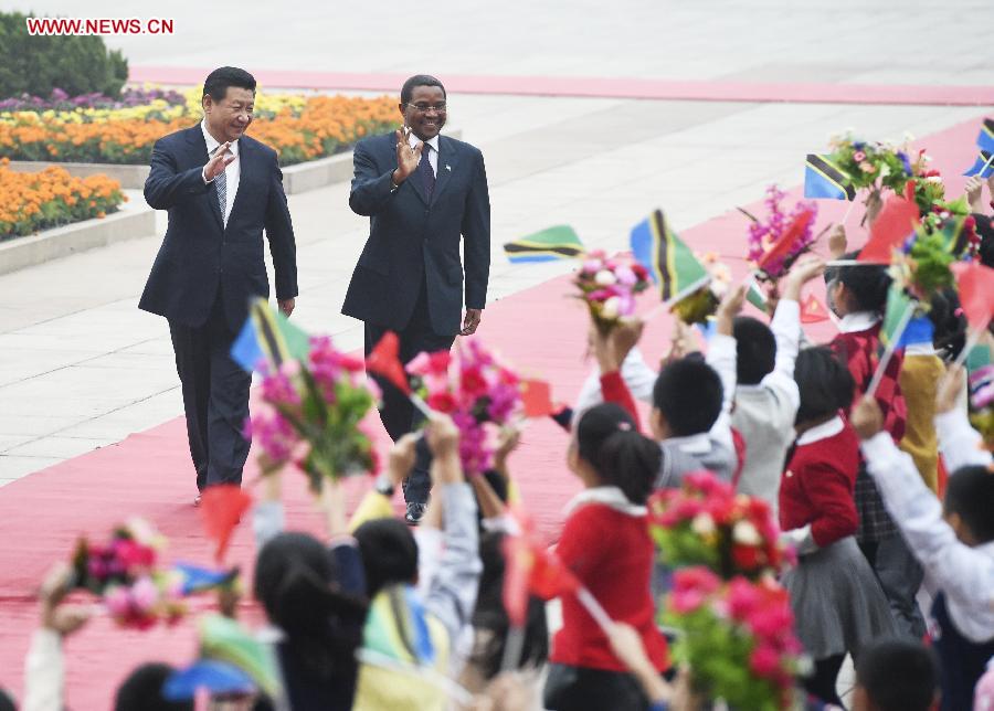 | Chinese President Xi Jinping (L) and Tanzanian President Jakaya Mrisho Kikwete wave to people during a welcoming ceremony held for the visiting Tanzanian president in Beijing, capital of China, Oct. 24, 2014. (Xinhua/Li Xueren) |