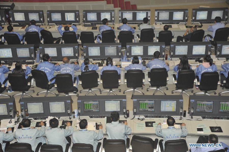 | Technicians make the first adjustment to the test orbiter for lunar mission at the Beijing Aerospace Control Center, in Beijing, China, Oct. 24, 2014. The test orbiter made its first adjustment successfully at 4: 29 p.m. on Friday under technicians' accurate control. (Xinhua/Tian Zhaoyun) |