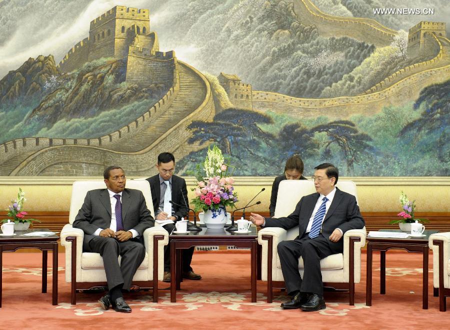 | Zhang Dejiang (1st R), chairman of the Standing Committee of China's National People's Congress, meets with Tanzanian President Jakaya Mrisho Kikwete in Beijing, capital of China, Oct. 24, 2014. (Xinhua/Zhang Duo) |