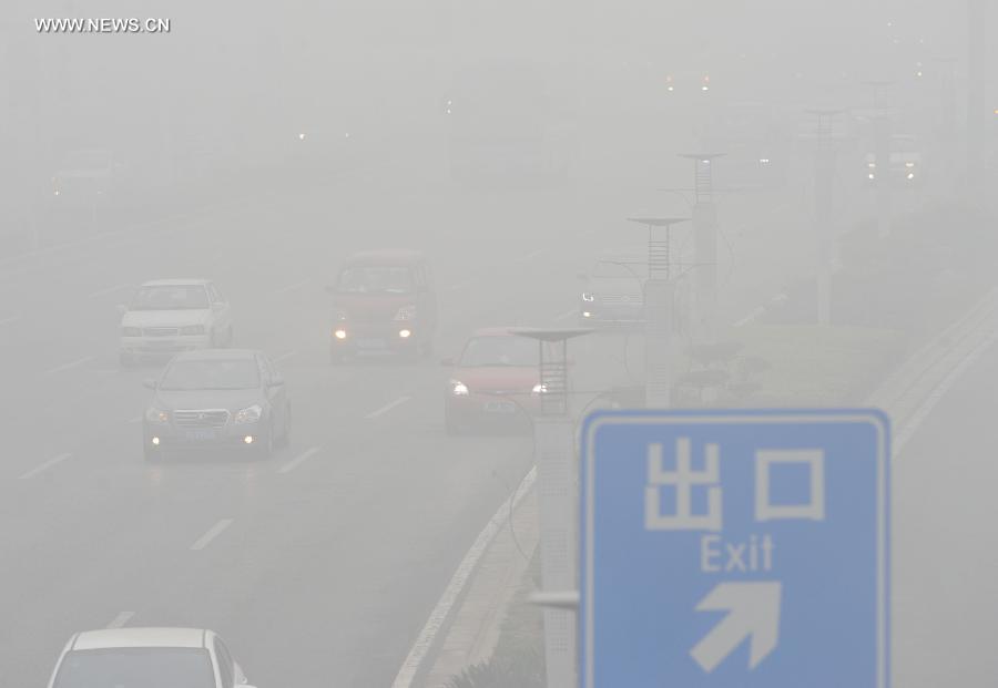 Vehicles run in smog-shrouded Tianjin, north China, Oct. 25, 2014. (Xinhua/Yue Yuewei)