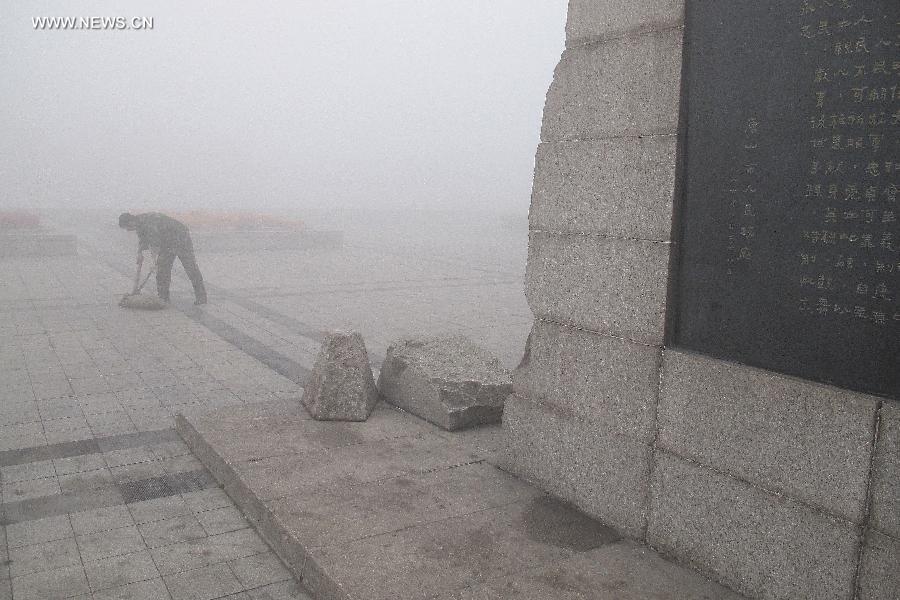 A sanitation worker clears the ground at a smog-shrouded square in Tangshan City, north China's Hebei Province, Oct. 25, 2014. (Xinhua/Zheng Yong)