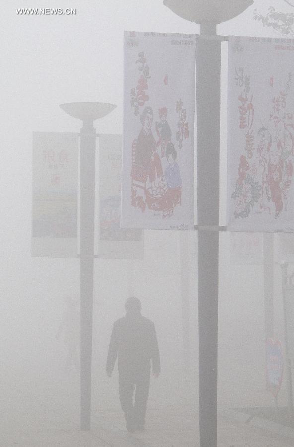 | A man walks at a smog-shrouded square in Tangshan City, north China's Hebei Province, Oct. 25, 2014. (Xinhua/Zheng Yong) |
