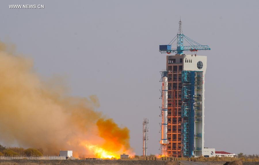 A Long March 2C carrier rocket carrying the Shijian-11-08 experimental satellite leaves the launch pad at the Jiuquan Satellite Launch Center in Jiuquan, northwest China's Gansu Province, Oct. 27, 2014. The Shijian-11-08 satellite, which was launched from Jiuquan at 2:59 p.m. Monday, will be used to conduct scientific experiments in space. The launch marks the 197th flight of the Long March rocket series. (Xinhua/Li Xiang)