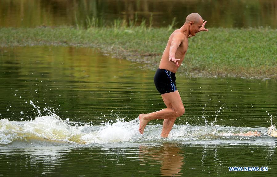 Shi Liliang, a monk from the Quanzhou Shaolin Temple performs Chinese Qinggong by running on water under thin plywood for about 118 meters in Quanzhou City, southeast China's Fujian province on Oct. 26, 2014. (Xinhua News Agency/Wei Peiquan)