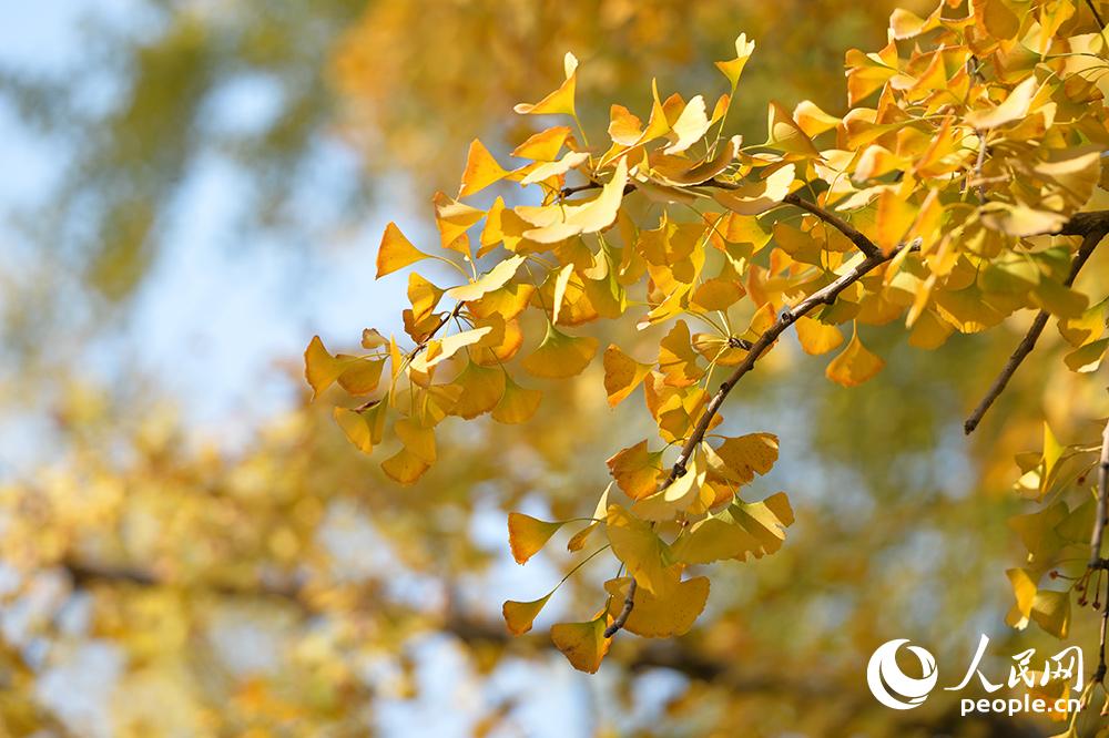 People enjoy the scenery of gingkgo leaves at Dongwujie in the Sanlitun area of Beijing on Oct. 27, 2014. The beautiful scenery of gingkgo trees in the city attract visitors every autumn. (People's Daily Online/Weng Qiyu)