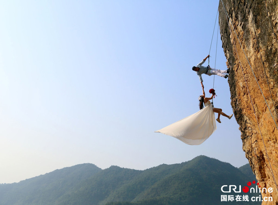 On October 26, 2014, a climbing fan and his wife climb to a 20-meter-high cliff to take their wedding photos in Jinhua, east China’s Zhejiang Province. (cri.cn)