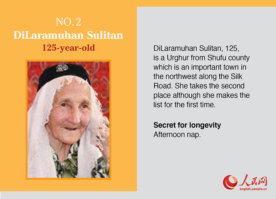 On Oct. 21, the Gerontological Society of China unveiled the list of the 10 oldest living people in China. Their average age is 119.7 years old. Of the 10, one is male and the others are female. They are from 7 provinces and 6 different ethnic groups. The three oldest ones are from Xinjiang.