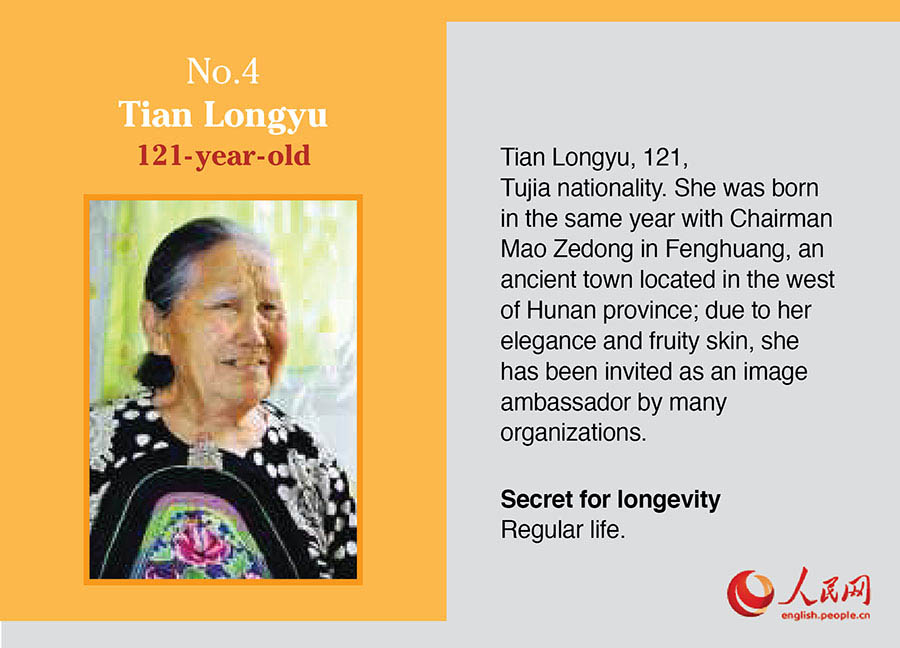 On Oct. 21, the Gerontological Society of China unveiled the list of the 10 oldest living people in China. Their average age is 119.7 years old. Of the 10, one is male and the others are female. They are from 7 provinces and 6 different ethnic groups. The three oldest ones are from Xinjiang.
