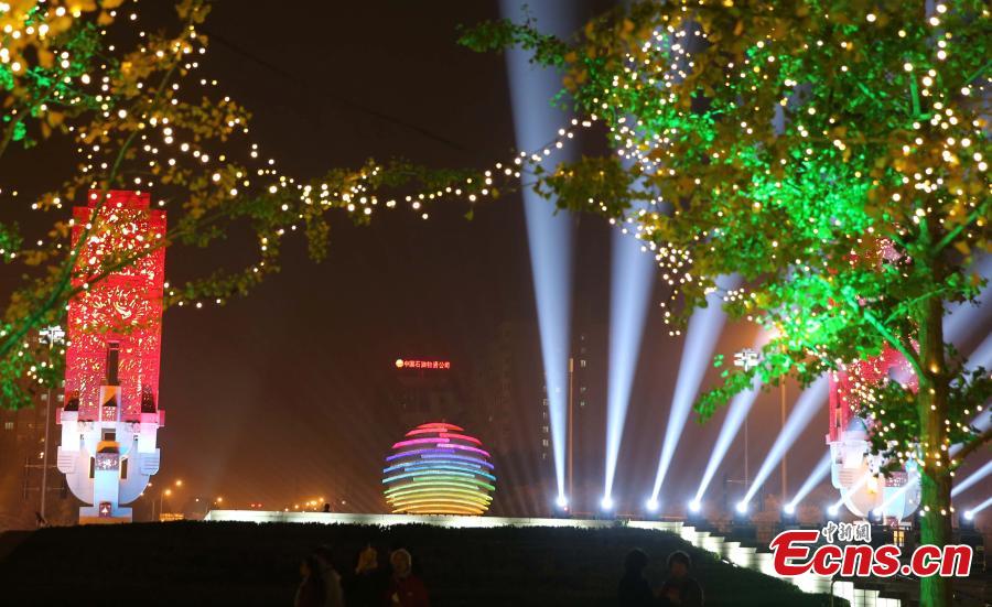 An APEC emblem-shaped light is turned on at an intersection in the Chaoyang district of Beijing, China’s capital on Wednesday evening, October 29, 2014. The emblem of the 2014 APEC meeting consists of 21 colored lines, which not only traces out the outline of the globe, but also the Temple of Heaven (Tiantan), a location for ritual ceremonies in ancient times. The emblem is a symbol of partnership and cooperation between APEC member economies. [Photo: China News Service/ Guo Junfeng]