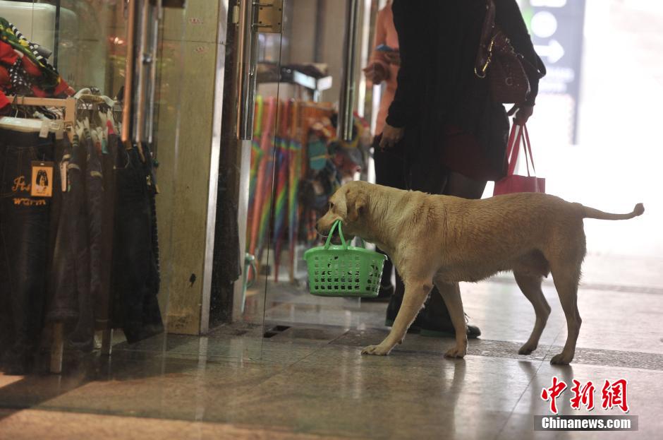 A dog runs behind its owner and carries its owner’s basket in a street of Chongqing on Oct. 29. (Chinanews.com/Chen Chao)