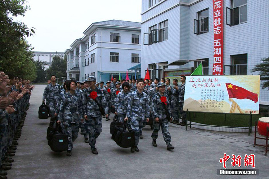 While arriving at the barracks, the new recruits are warmly welcomed by the soldiers. (China News Agency/Yi Kaihong)