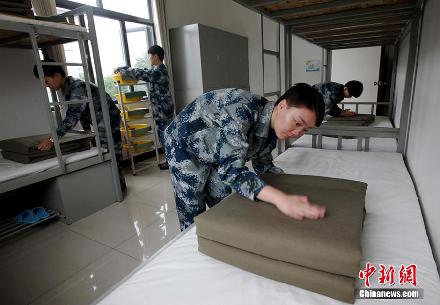 New recruits learn to fold their quilts. (China News Agency/Yi Kaihong)