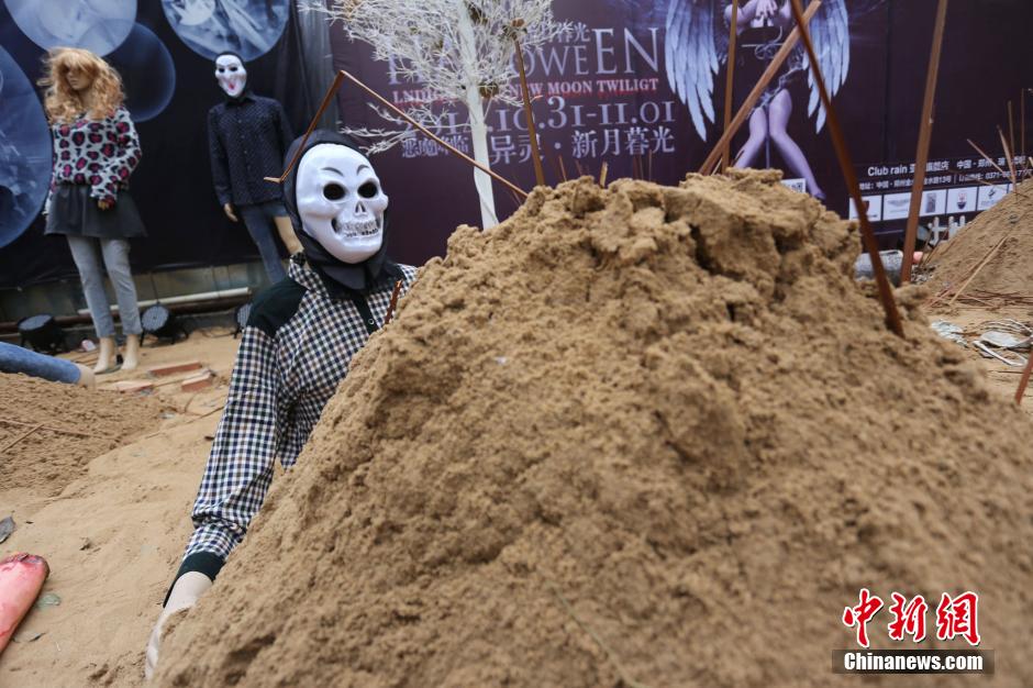Grave mounds appear in front of a KTV in Zhengzhou, Henan Province. (CNS/Yang Zhenghua)