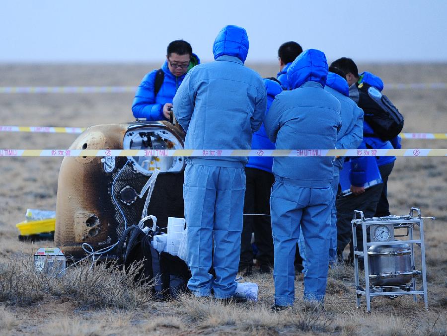 Researchers retrieve the return capsule of China's unmanned lunar orbiter in the central region of north China's Inner Mongolia Autonomous Region, Nov. 1, 2014. Return capsule of China's test lunar orbiter landed successfully early Saturday morning in north China's Inner Mongolia Autonomous Region, according to the Beijing Aerospace Control Center. (Xinhua/Shao Kun)