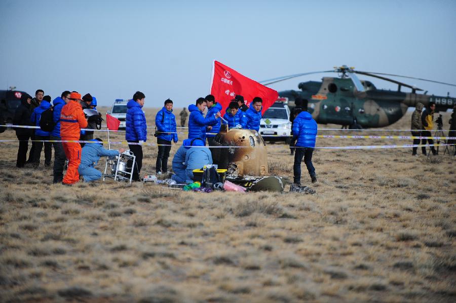 Researchers retrieve the return capsule of China's unmanned lunar orbiter in the central region of north China's Inner Mongolia Autonomous Region, Nov. 1, 2014. Return capsule of China's test lunar orbiter landed successfully early Saturday morning in north China's Inner Mongolia Autonomous Region, according to the Beijing Aerospace Control Center. (Xinhua/Shao Kun)