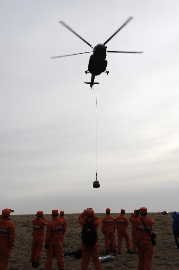 A helicopter transfers the return capsule of China's unmanned lunar orbiter in the central region of north China's Inner Mongolia Autonomous Region, Nov. 1, 2014. Return capsule of China's test lunar orbiter landed successfully early Saturday morning in north China's Inner Mongolia Autonomous Region, according to the Beijing Aerospace Control Center. (Xinhua/Ju Huanzong)
