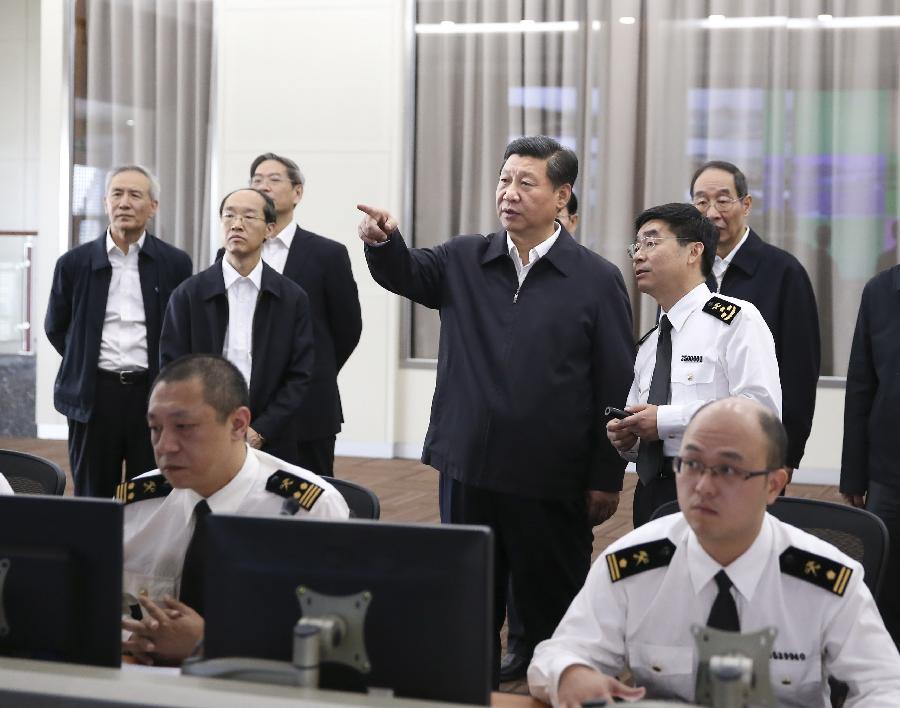 Chinese President Xi Jinping (C) visits a customs monitoring center of the Pingtan Port in the pilot development zone in Pingtan, southeast China's Fujian Province, Nov. 1, 2014. Xi made an inspection tour to southeast China's Fujian Province on Nov. 1 and 2. (Xinhua/Lan Hongguang)