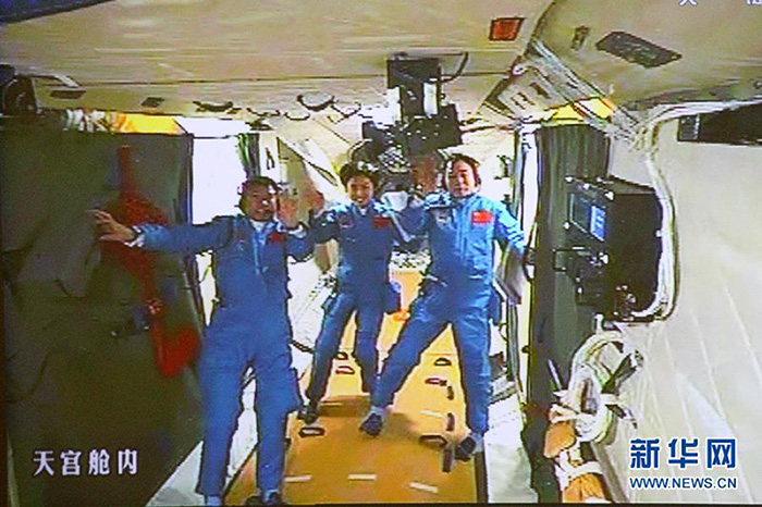 Astronauts Jing Haipeng, Liu Wang, Liu Yang are in Tiangong 1 on June 18, 2012. (Xinhua/Cha Chunming)