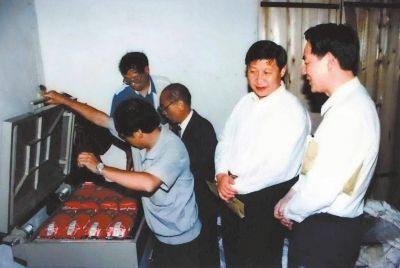 Photo taken in May 1996 shows Xi Jinping, then Deputy Party Secretary of Fujian province, visiting a tea processing factory in Changting County, Fujian province. (Photo source: Fujian Daily)