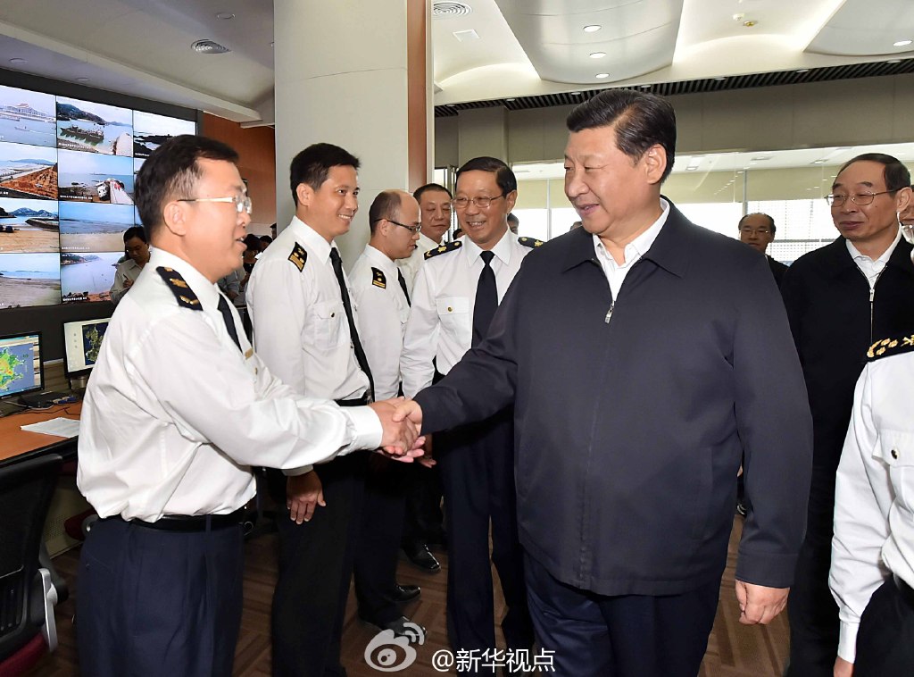 Chinese President Xi Jinping visits a customs monitoring center of the Pingtan Port in the pilot development zone in Pingtan, southeast China's Fujian province, Nov. 1, 2014. Xi made 20 research visits to Pingtan when he was working in Fujian and feels a special connection to the place. (Photo source: Weibo account of Xinhua Shi Dian)
