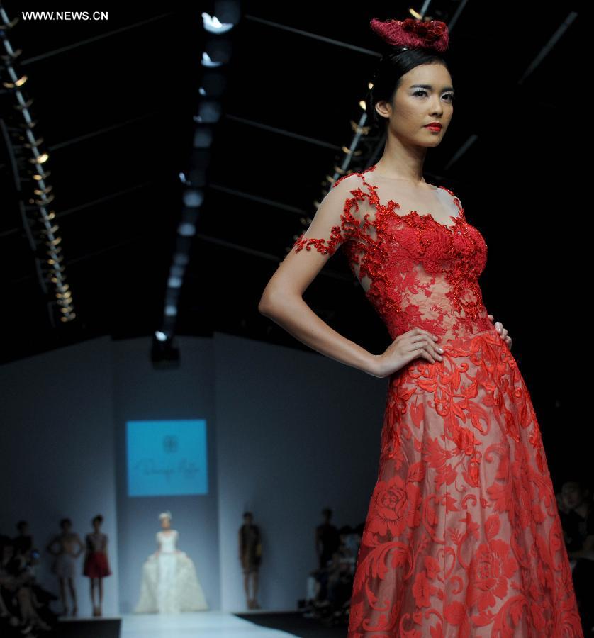 A model presents a creation by Indonesian designer Dominique Nadine during the Jakarta Fashion Week 2015 in Jakarta, Indonesia, Nov. 5, 2014. (Xinhua/Agung Kuncahya B.)