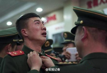 Soldiers are grieved to bid farewell to their military ranks and guns when are discharged from active duty. (Photo/Official Micro-blog of Junbao Jizhe)
