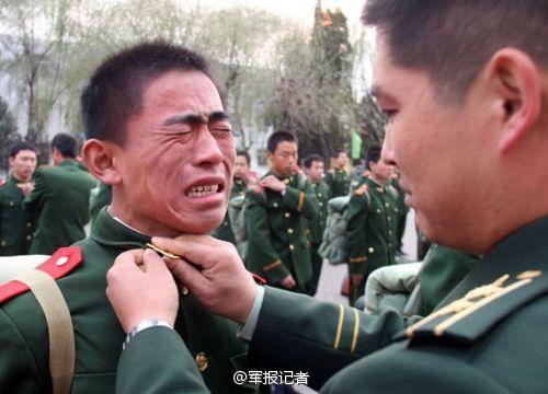 Soldiers are grieved to bid farewell to their military ranks and guns when are discharged from active duty. (Photo/Official Micro-blog of Junbao Jizhe)