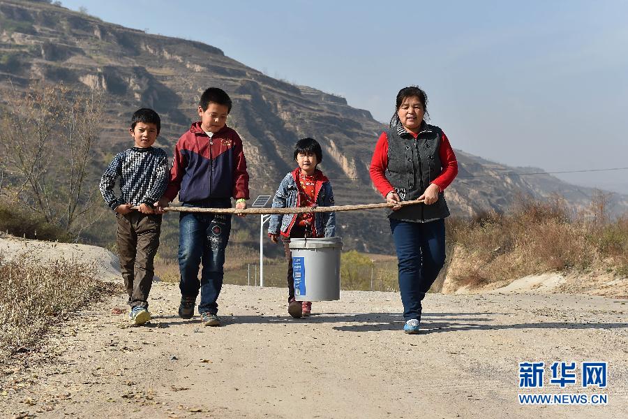 Li and students carry water from well to school on Oct. 22, 2014. (Xinhuanet/Zhan Yan)