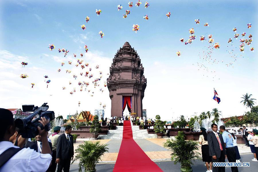 Balloons are released into the sky on the Independence Day in Phnom Penh, Cambodia, Nov. 9, 2014. Cambodia marked the 61st anniversary of the declaration of the Independence Day from French protectorate on Sunday. (Xinhua/Phearum)