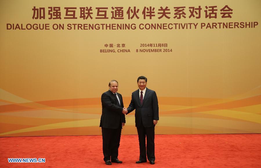 Chinese President Xi Jinping (R) welcomes Pakistani Prime Minister Nawaz Sharif to attend a Dialogue on Strengthening Connectivity Partnership in Beijing, capital of China, Nov. 8, 2014. (Xinhua/Lan Hongguang)